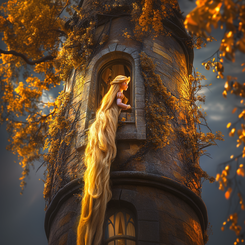 - Locika seděla u okna a nechala své dlouhé zlaté vlasy splývat po věži.